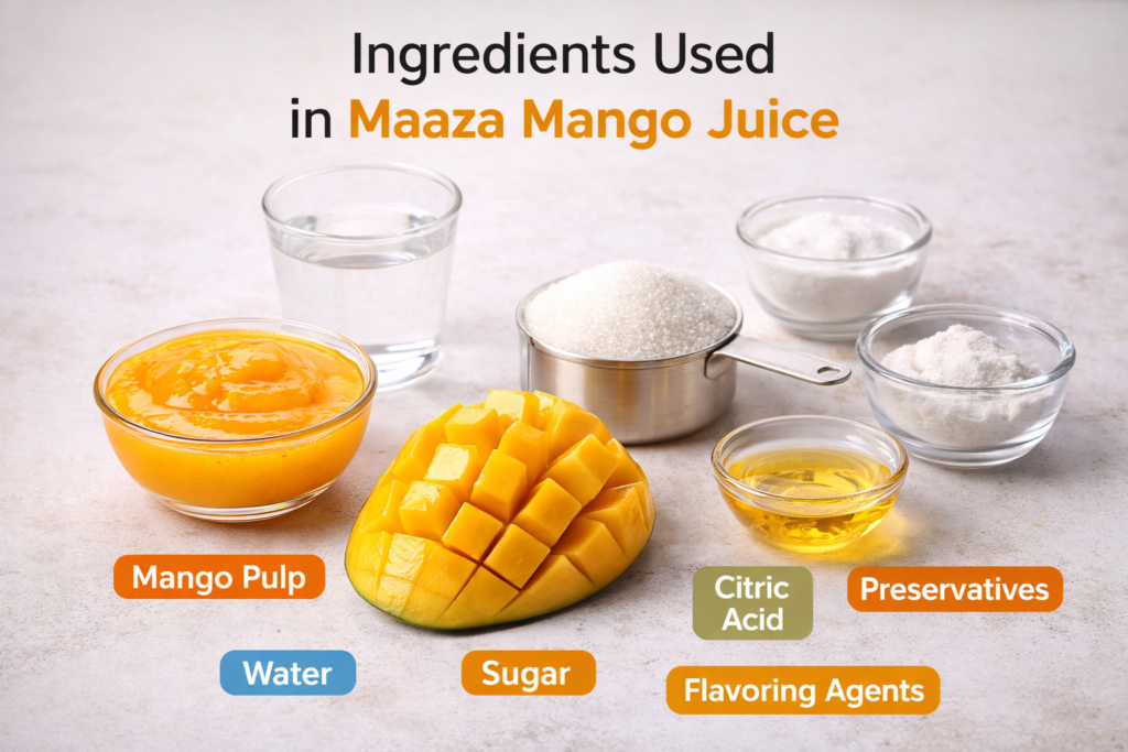 Unlike fresh juice, Maaza is a processed fruit drink, meaning it contains a mix of natural pulp and added ingredients for consistency and flavor.
